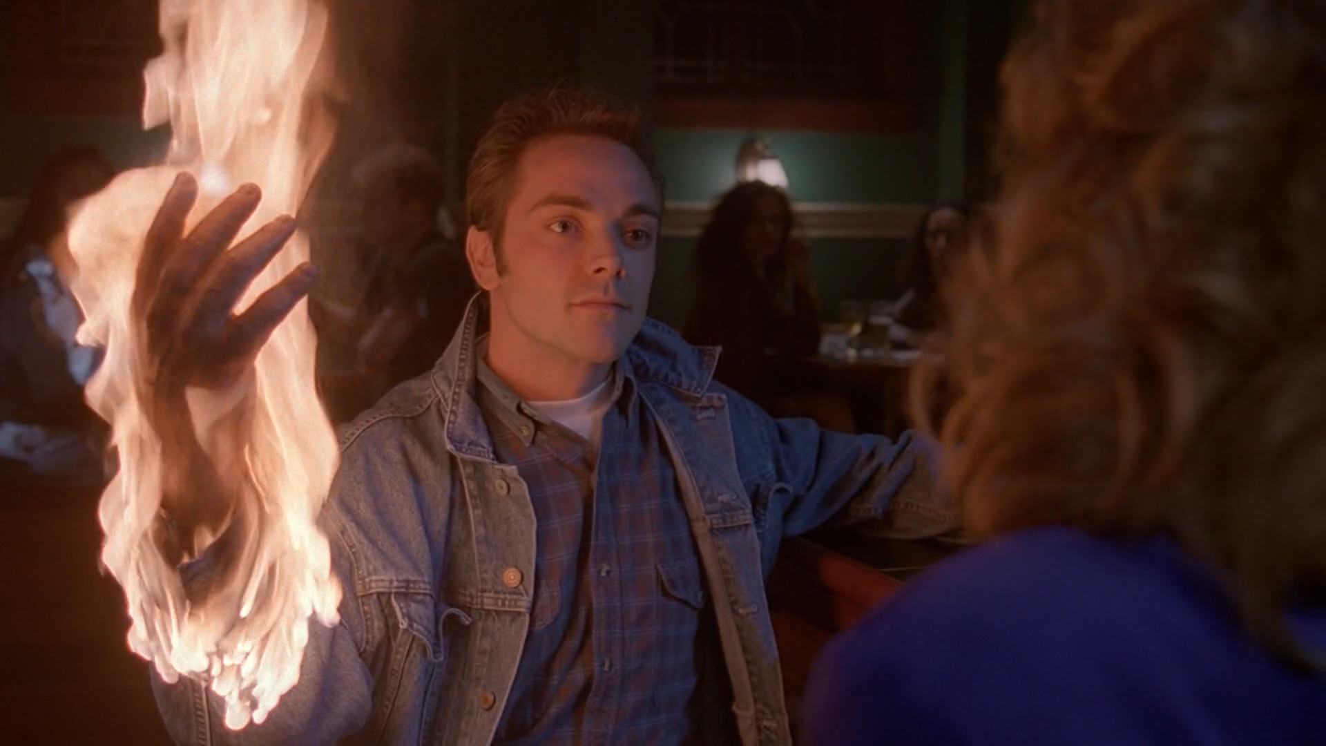 Three things are needed to start a fire: heat, fuel and oxygen, but what starts the fires of love in the human heart? Seeing Mulder kissed by Phoebe, a spark is lit in Scully’s heart, and perhaps the flames of jealousy. To help him solve the case, and to have a reason to join him in Boston, Scully writes a psychological profile of the pyromaniac. Mulder, who has a phobia of fire, is no match for the man who loves it. In the climax, when the caretaker is consumed by flames, he doesn’t die, and his skin regenerates. Yet he might have a death-wish, considering how many cigarettes he smokes.
