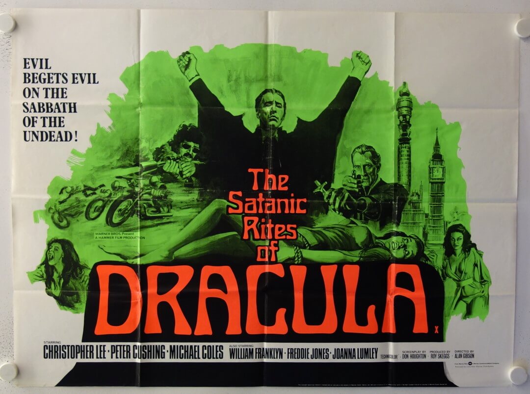 Van Helsing puts the sad vampire out of his misery. Pulling a fence post from the ground, he drives it through Dracula’s heart for the coup de grâce. In this iconic scene, as Dracula crumbles into dust, Christopher Lee bids farewell to the role he played nine times.