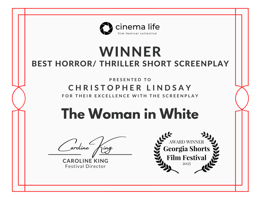 My screenplay, The Woman in White, was the winner for best thriller/horror short screenplay at the Georgia Shorts Film Festival 2025.